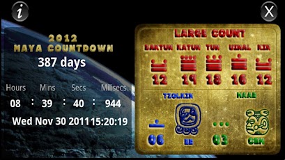 Count Calendar comes to an abrupt end. Besides, it shows the current date in gregorian format and 3 Maya formats: Long Count, Tzolkin (260-day), Haab (365-day), changing every day its respective glyphs.