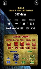 Count Calendar comes to an abrupt end. Besides, it shows the current date in gregorian format and 3 Maya formats: Long Count, Tzolkin (260-day), Haab (365-day), changing every day its respective glyphs.